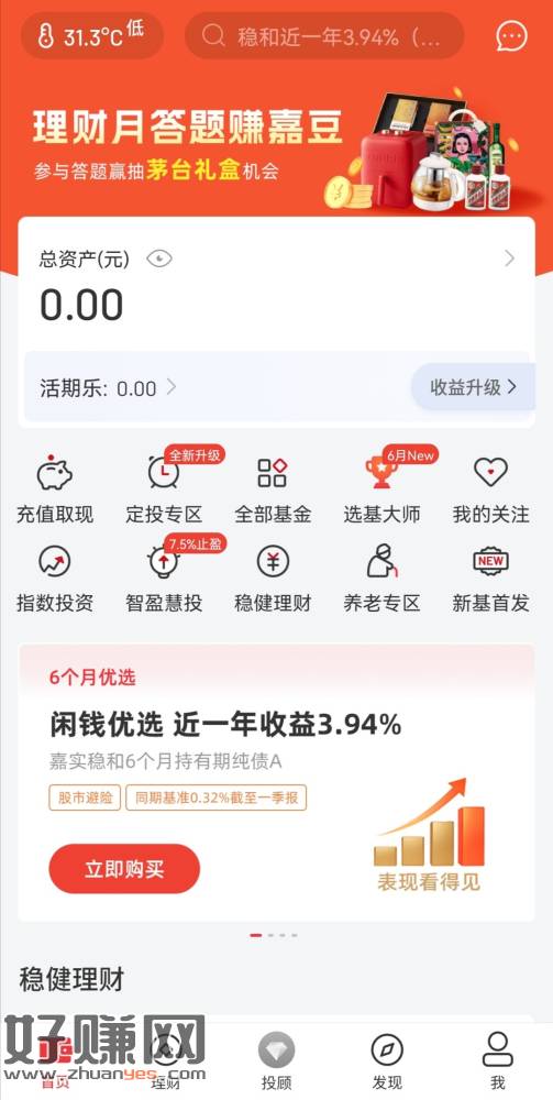 嘉实理财嘉APP,首页横幅,规则说全对才有1000积分,我答