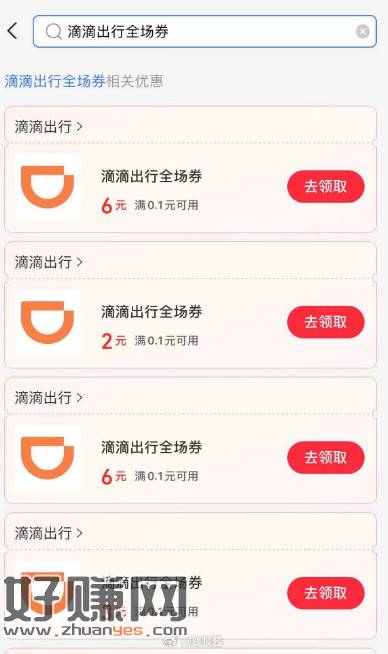 支付宝,消费券,搜滴滴出行全场劵,有两张6元无门槛