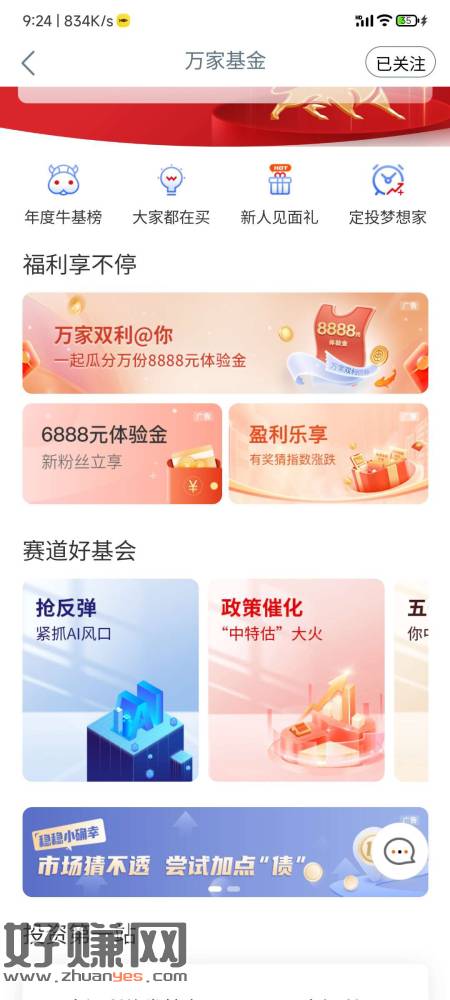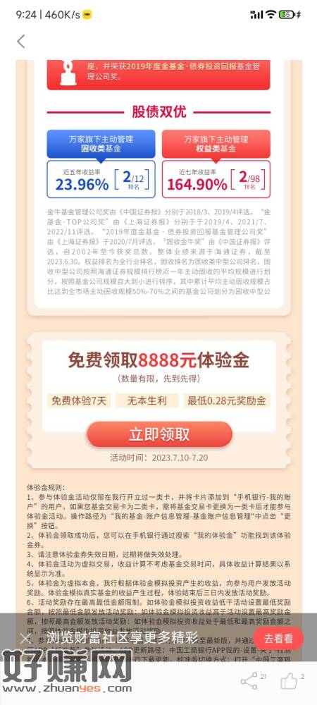 打开中国工商银行APP搜索“万家基金”进去场景号里,点滚动图“万家双利@你”进去下拉点领取8888元体验金,7天收益可以选择自动提现到银行卡,工行体验金的活动需要有工行一类卡才可以参加。返回首页财富号还有个6888体验金,也是一样的要有一类的才可以,有一类的可以去弄
