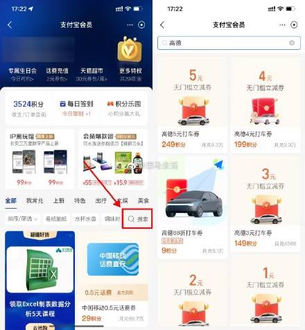 【支付宝积分兑换高德1~5元券】支付宝APP->我的->支付宝会员->搜索“高德”有很多积分兑换打车券