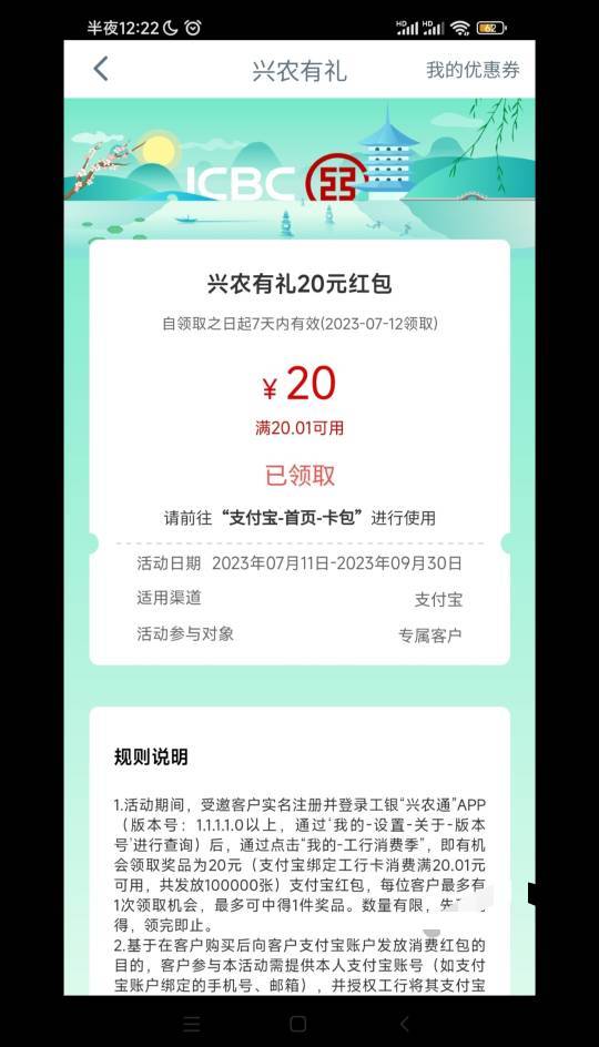 兴农通20,这次是领到支付宝 都去看看吧,只有部分人有,没有的就W视搜索 工行消费季