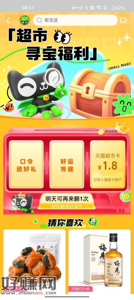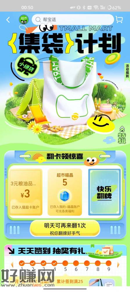 猫超首页左上角签到,小绿袋福利,下拉超市寻宝福利