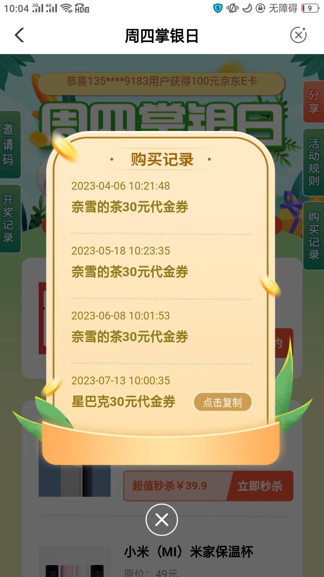 辽宁农行周四秒杀每月一次,我是湖北手机号每月都能抢到一次,不能抢的勿喷,如果10点没抢到就10点20去,祝老哥们好运。