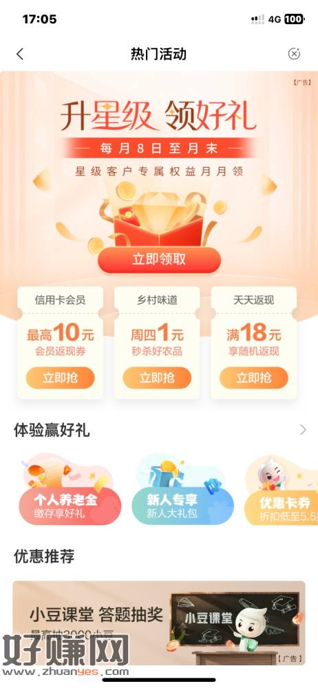 农行 星级用户 领东西了 但是系统在升级晚上八点到凌晨两点好
