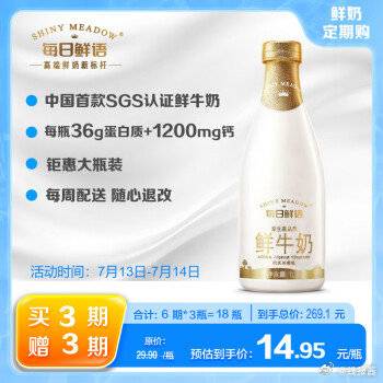 买3期赠3期,共18瓶,269.1元,折14.95元/瓶