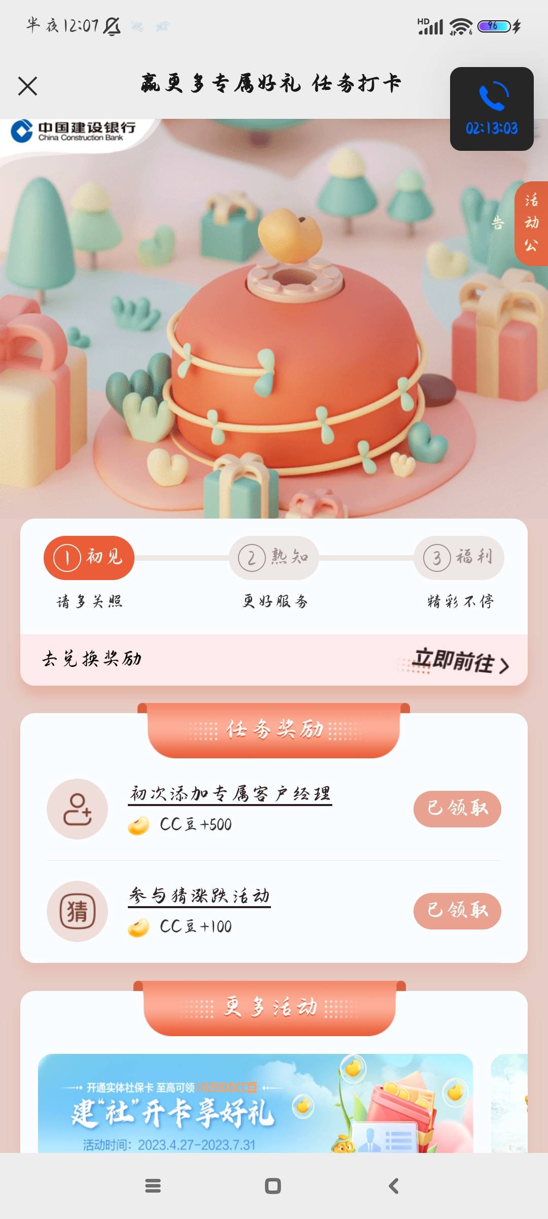建行差不多应该有1000cc豆左右 入口公众号中国建设银行找客户经理 随便点个客户经理的云工作室进去 横幅任务打卡