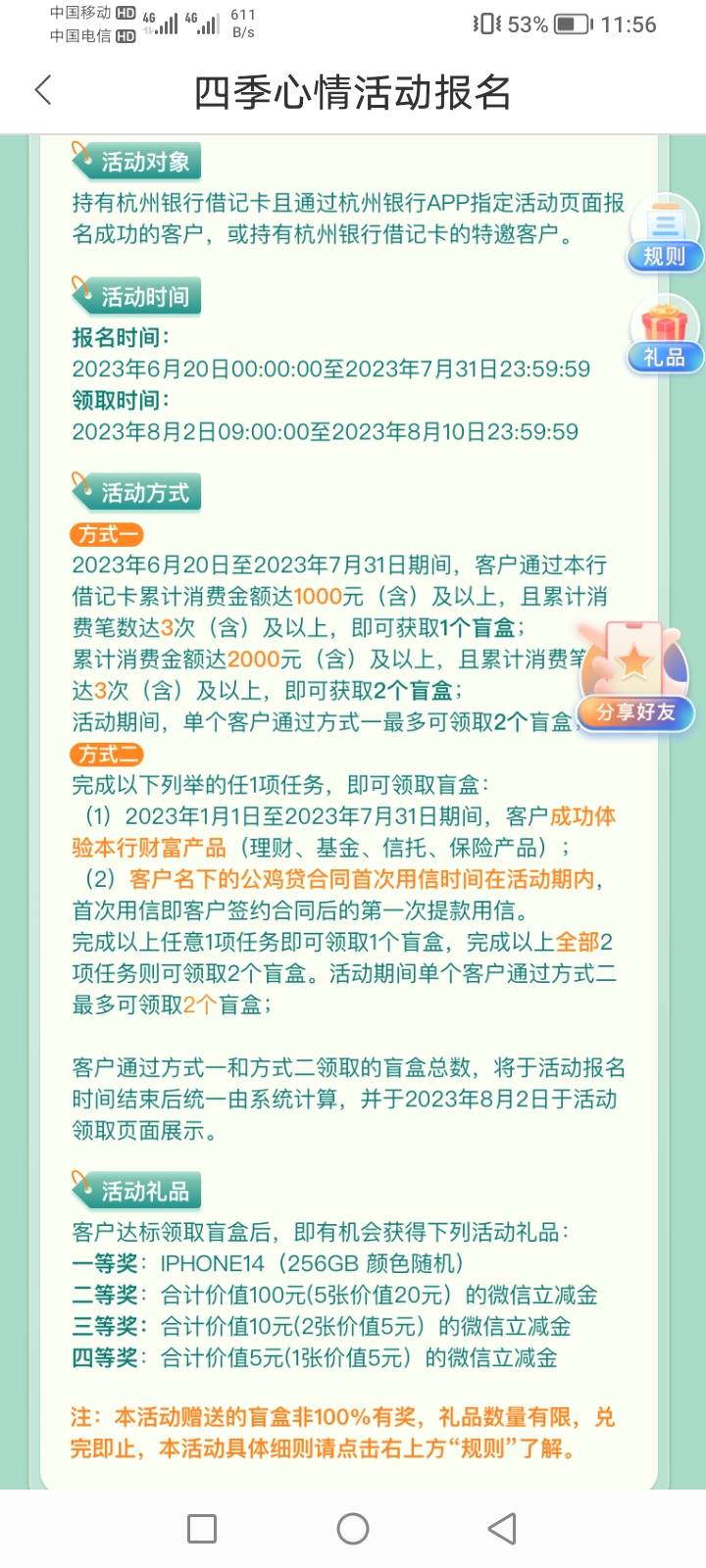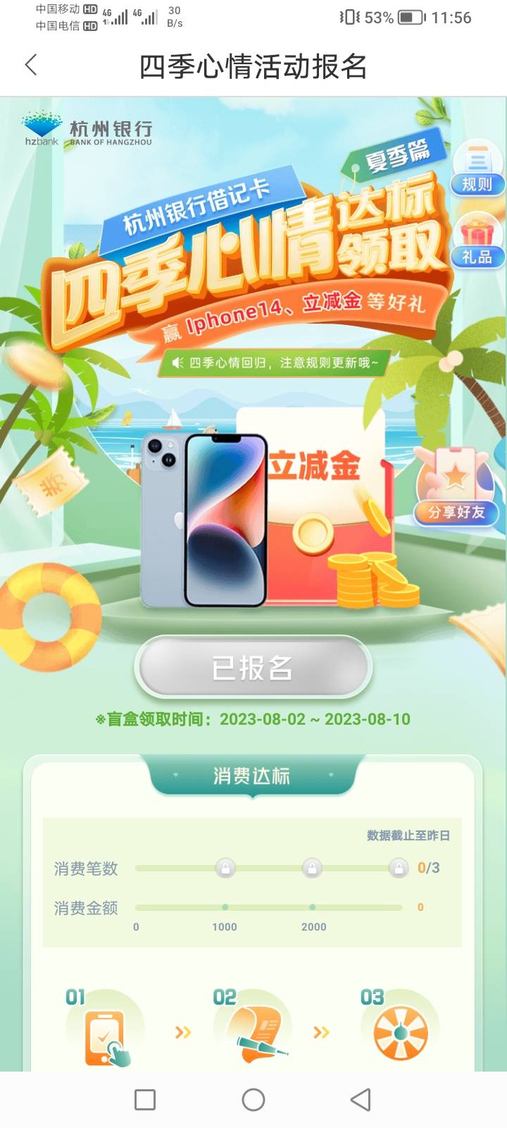 杭州银行首页四季心情报名了!!!消费1000三笔以上