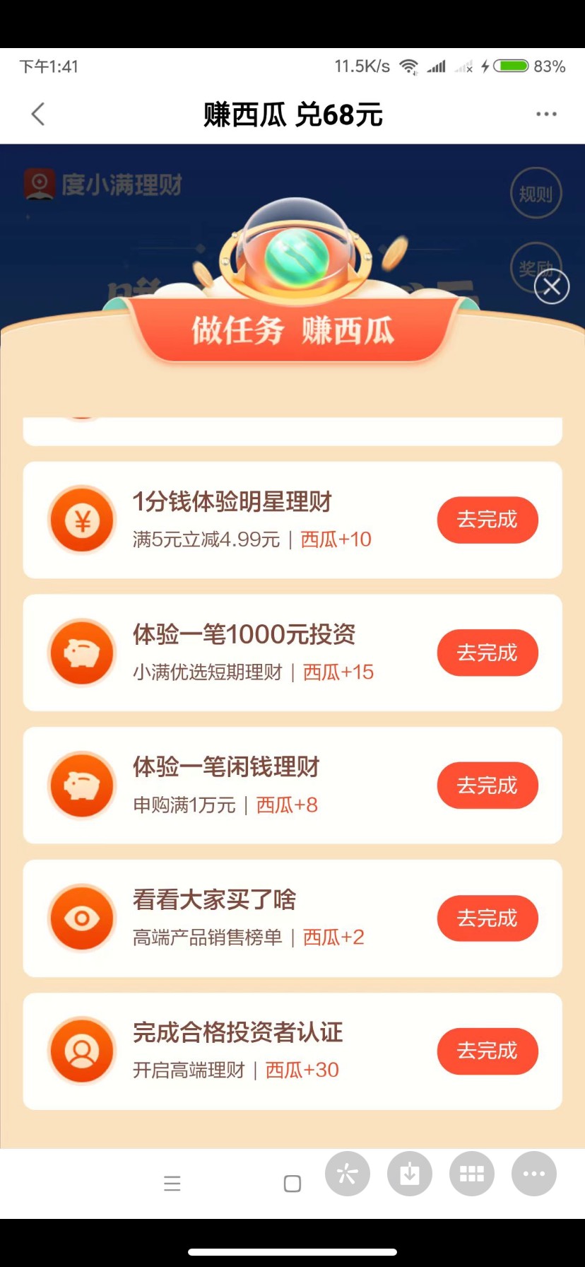 度小满集西瓜兑现金。有几个简单任务可以做*做完去兑6毛