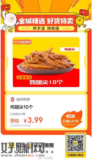 美团到店,绝味鸭脖|鸡翅尖10个,3.99