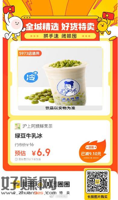 沪上阿姨鲜果茶|绿豆牛乳冰,6.9
