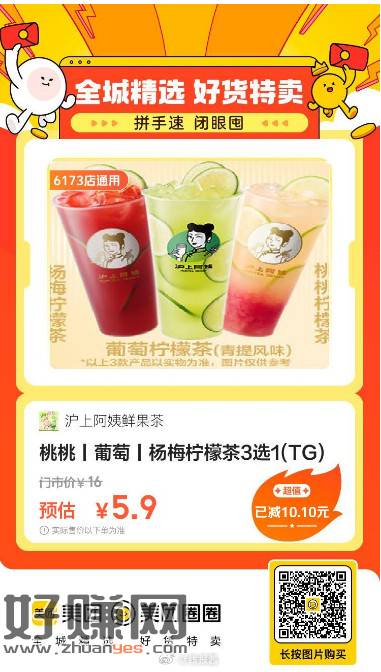 沪上阿姨鲜果茶|桃桃丨葡萄丨杨梅柠檬茶3选1,5.9