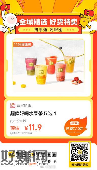 奈雪的茶|超值好喝水果茶 5 选 1,11.9