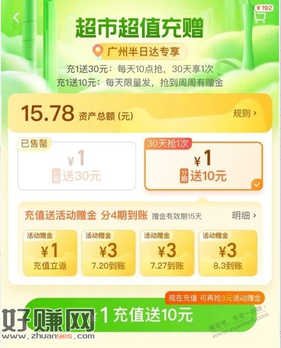 天猫超市-右上角地址定位至杭州市/广州市/深圳市/东莞市。首页中间“今日疯抢”下方“超值充赠”横幅进入-可参与充1送10元猫超卡(加赠3元活动赠金),活动赠金分4期到账,赠金有效期15天,每日数量有限,先到先得,每30天可享一次优惠。
