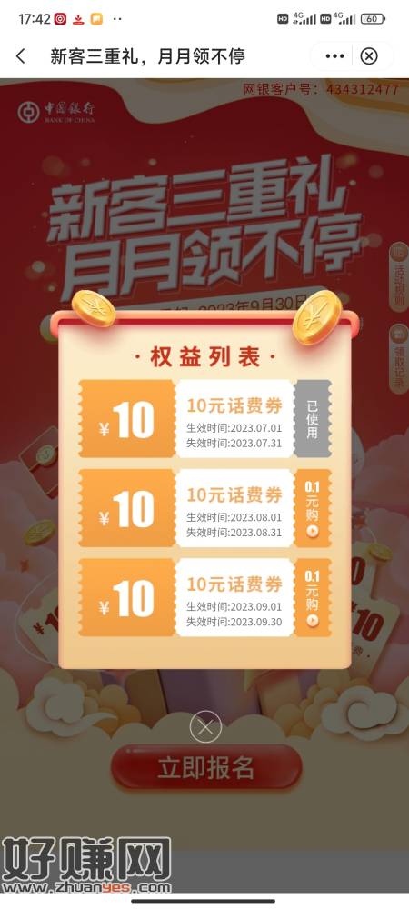 每月10话费,共三个月,中行生活改合肥,不知道是不是限制安徽