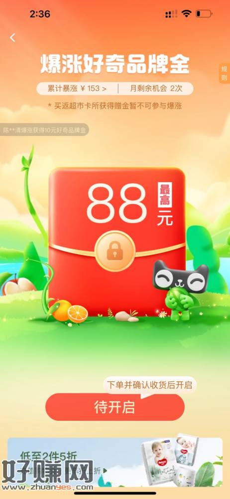 今日猫超暴涨是好奇品牌金,保底5,基本10。可以买纸尿裤,棉柔巾,湿巾,牛乳纸等等。暴涨途径(天猫超市-我的-超市卡-下拉 补贴品牌金)。看得上的冲。暴涨的猫卡过期可以补(已测试)