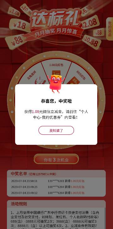 立减金小羊毛…… 中行点击生活,进入中间最左边一个,里边可以抽奖,四次