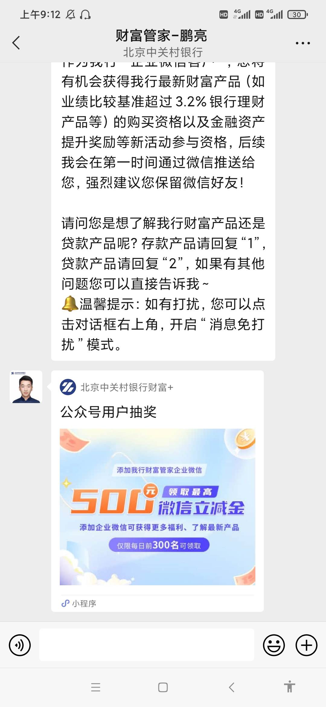 微信关注公众号北京中关村银行,然后根据推文加企业微信,直接就可以抽奖,