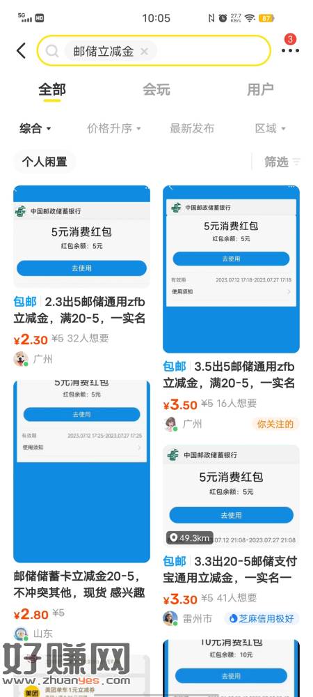 咸鱼搜索邮储立减金,通用,有需要的可以去拍