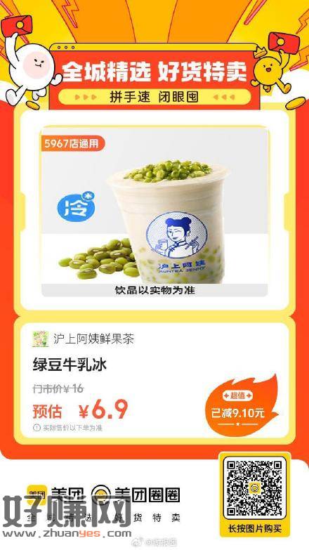 美团到店,沪上阿姨鲜果茶|绿豆牛乳冰,6.9