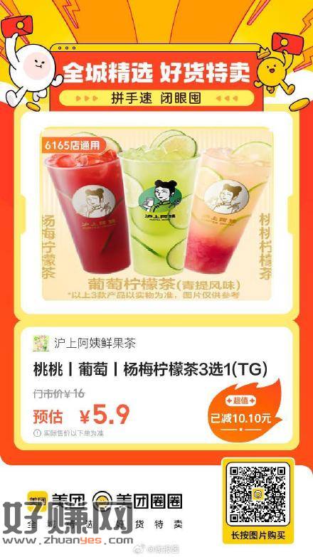 沪上阿姨鲜果茶|桃桃丨葡萄丨杨梅柠檬茶3选1,5.9
