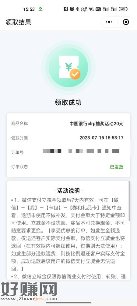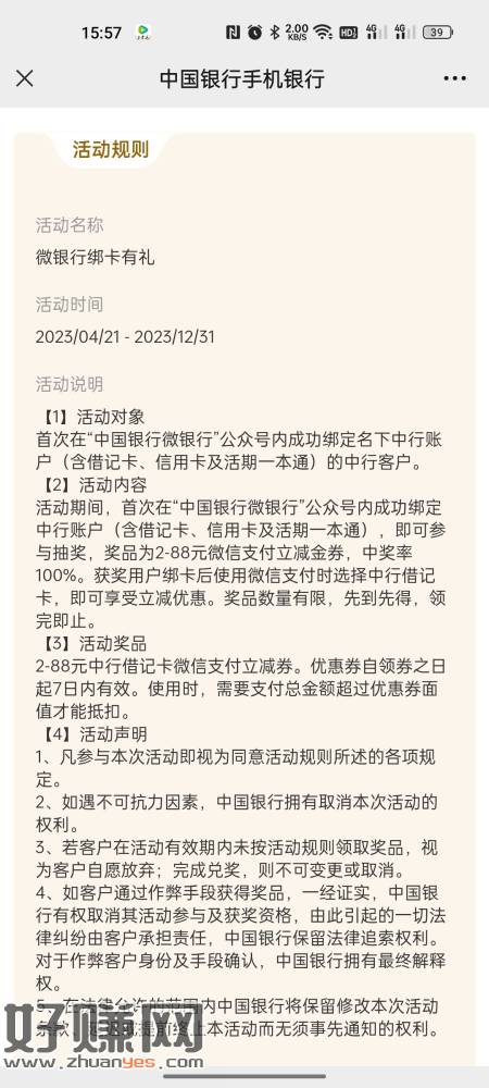 中国银行微银行公众号左一,绑卡抽奖,要第一次绑卡抽2-88