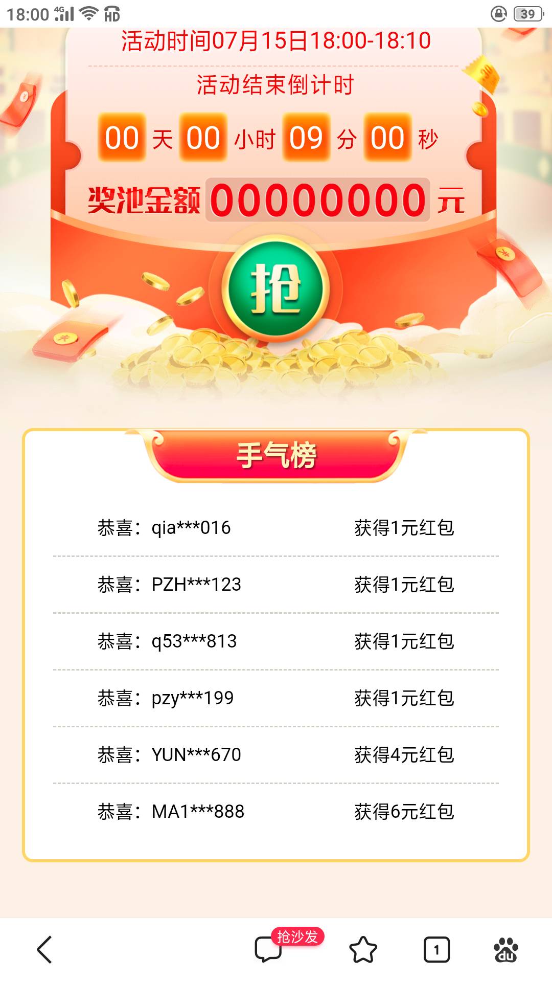 周日支付宝弹4~6元红包