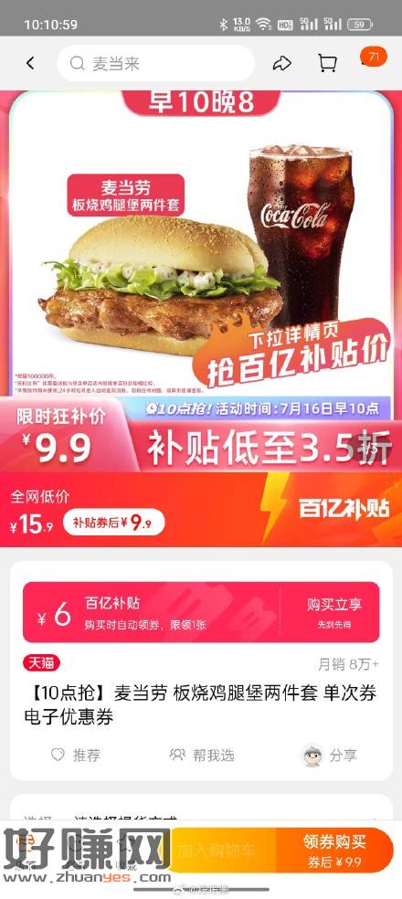 麦当劳 板烧鸡腿堡两件套,百亿补贴价9.9