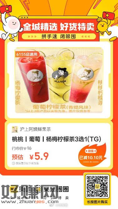 沪上阿姨鲜果茶|桃桃丨葡萄丨杨梅柠檬茶3选1,5.9