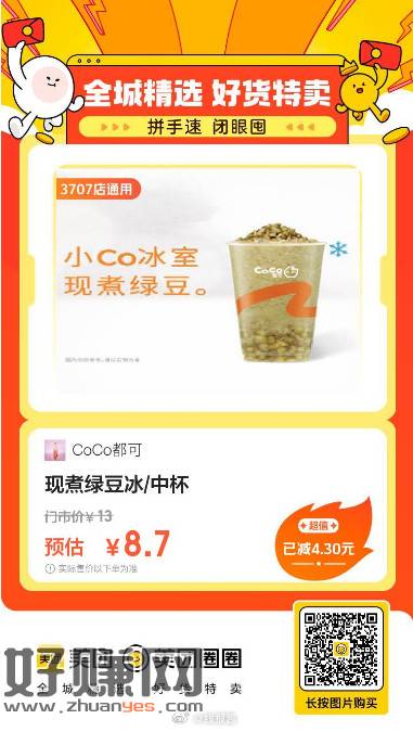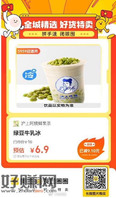 沪上阿姨鲜果茶|绿豆牛乳冰,6.9