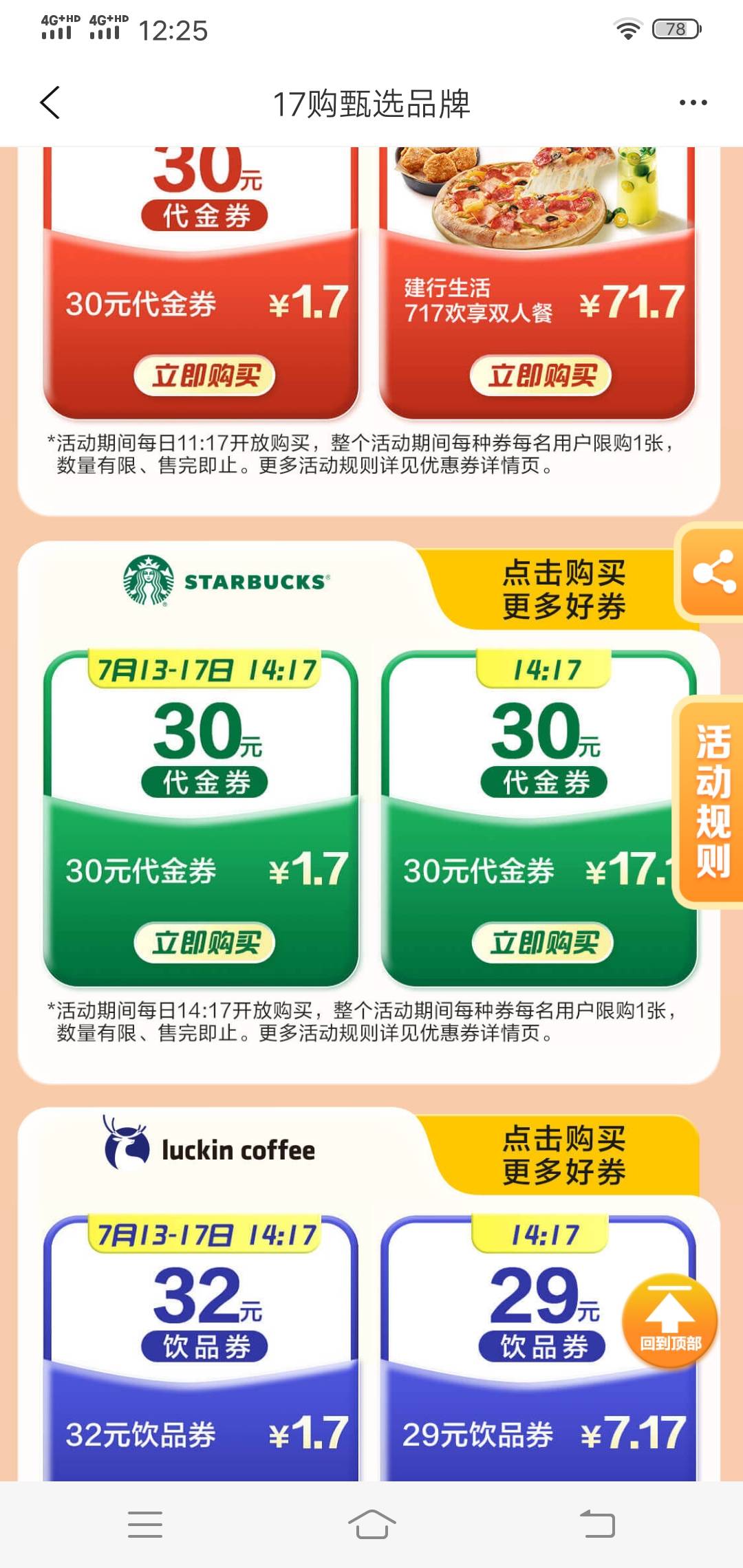2点17建行生活1.7秒杀各种饮品30代金卷