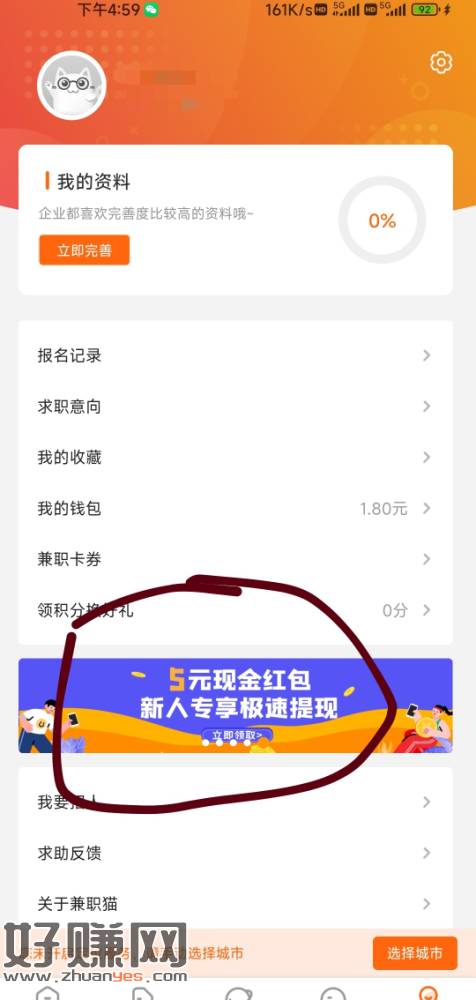 应用市场搜索兼职猫极速版 送5 第一天1.8其他在第二天 老用户注销重新登录就可以 1.8也可以直接提 但是无门槛只能提一次所以建议第二天提5