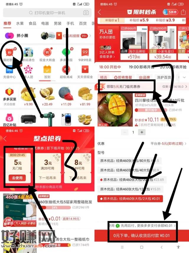 拼多多-首页“限时秒杀”,下拉可领5元无门槛优惠,1分钱两包纸