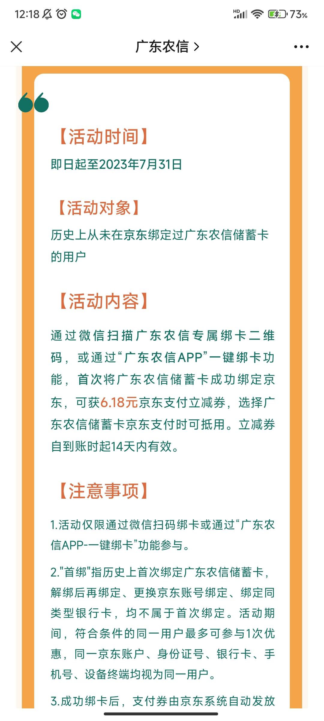 通过vX扫描广东农信专属绑卡二维码,或通过“广东农信APP”一键绑卡功能, 首次将广东农信储蓄卡成功绑定京东,可获6.18元京东支付立减券. 选择广东农信储蓄卡京东支付时可抵用。立减券自到账时起14天内有效。