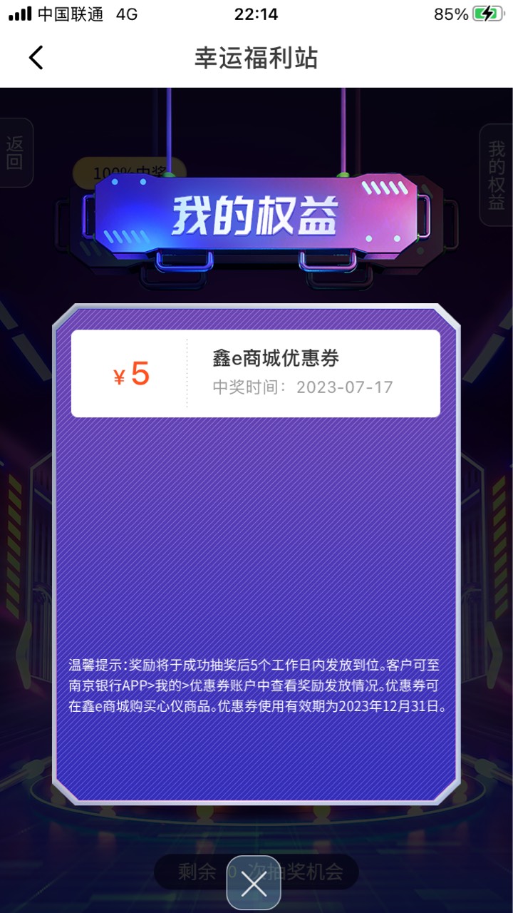 南京银行10-25毛,综合积分做下,首页财富嘉年华能量任务做下,能量第一个等级抽奖一次最少五抵扣劵,能量同时也增加到积分里,用抵扣券➕积分在鑫E商城购买自己喜欢的东西
