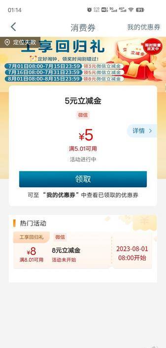 工行App,搜索工行消费季,进入领取5元VX立减金。 还有8月1日可