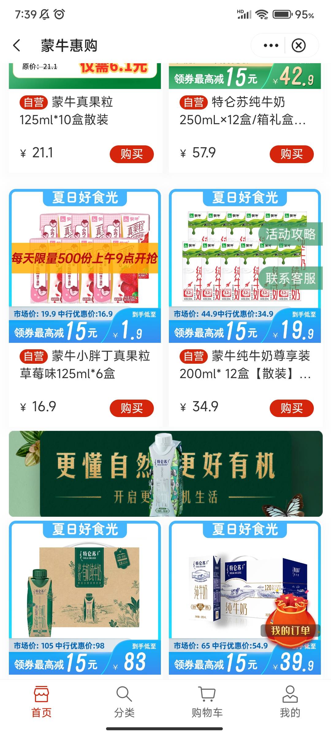 没事去中行,生活区,蒙牛。。。 领取15劵,1.9买6瓶小牛奶也不错