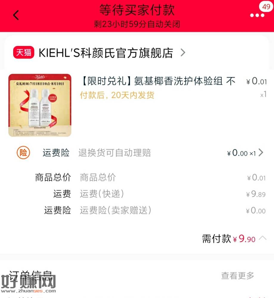 天猫,科颜氏,抽奖积分搞800兑换洗护t 装,付邮9.9!