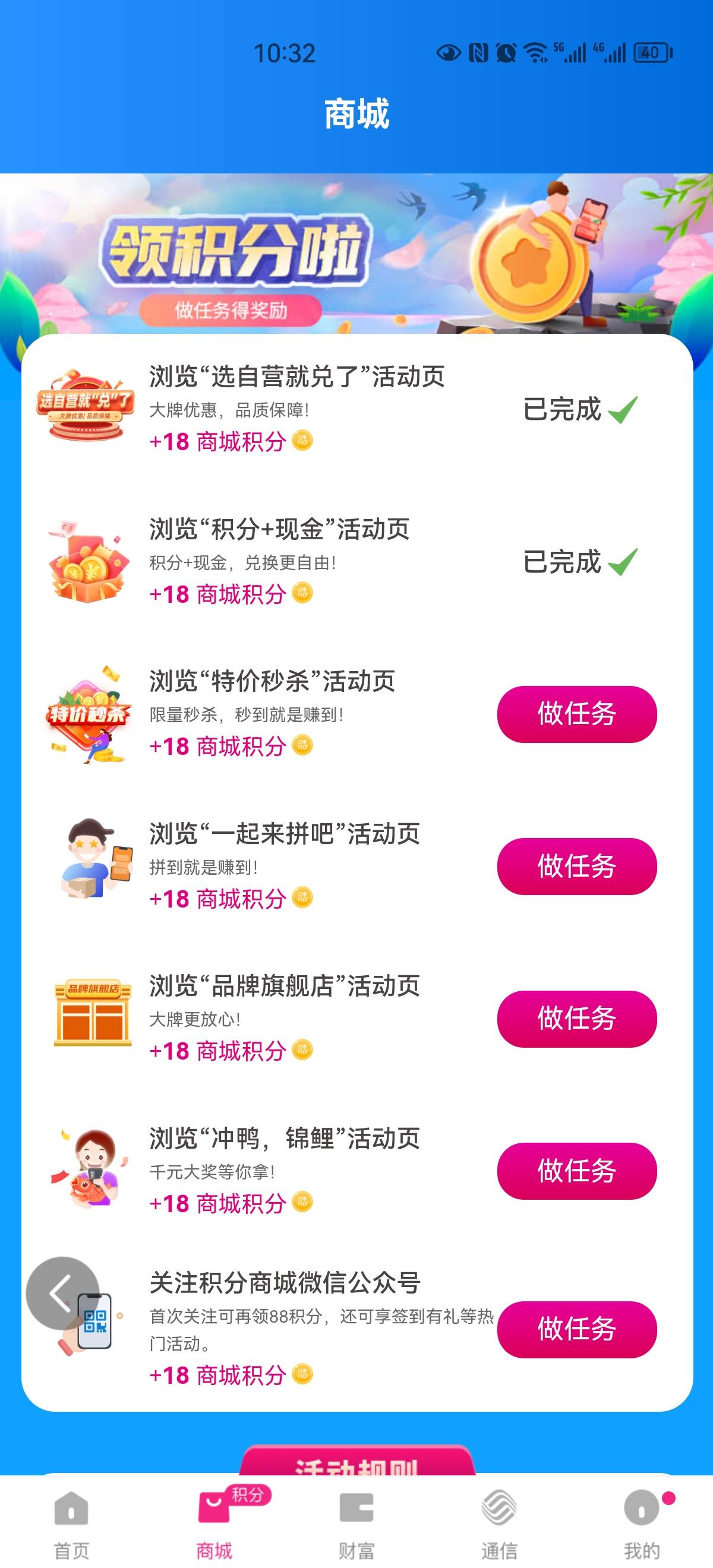 和包领取150-200积分 从和包APP进入活动可以使用1积分可以抽商城积分 再去完成7个任务,每个任务获得18积分,一共保底获得150积分 打开和包APP点击底部【商城】顶部滚动入口【积分狂欢季福利享不停】进入参与抽奖 然后下拉找到【领积分啦】进入,完成7个任务,点击返回就行,每个17积分