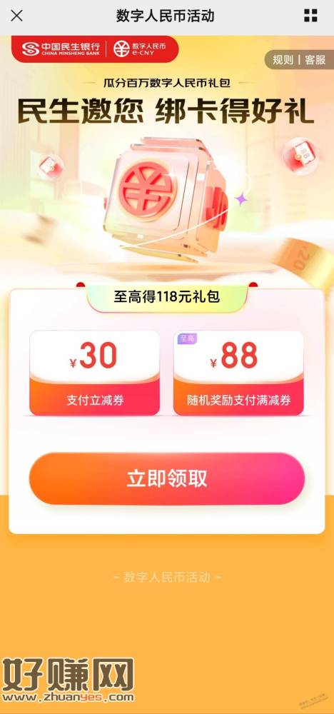 【京东】省钱福利!领至高118元数字人民币支付礼包,京东消费可用,绑定民生借记卡即可领取。戳>3.cn/v/4xrqCw 回N退订