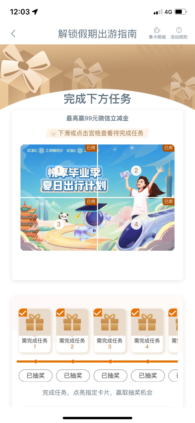 工行“解锁假期出游指南”,最高99立减,只有今明两天。 玛德,我脸黑,5中0。