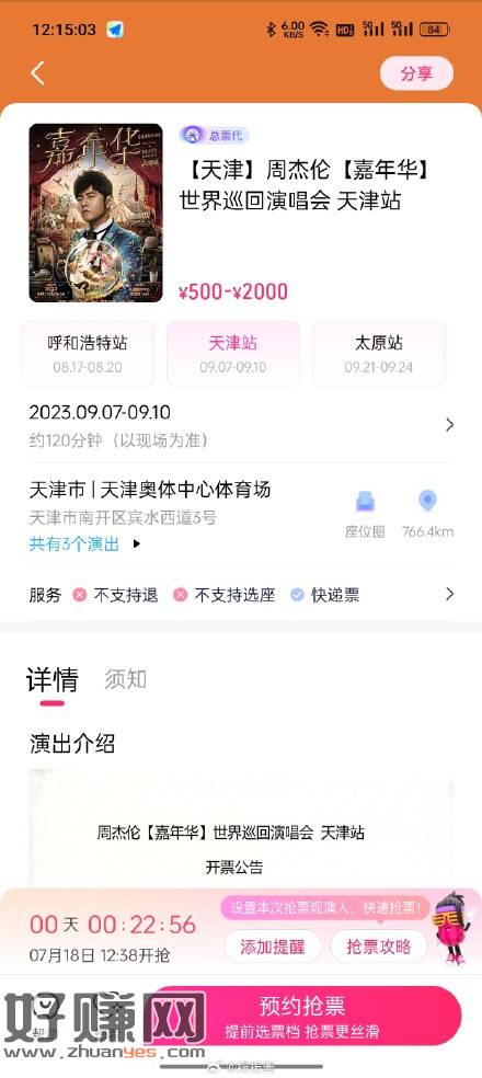 大麦APP12:30/13:35/14:38有周杰伦天津站票,不知道难不?刚下APP