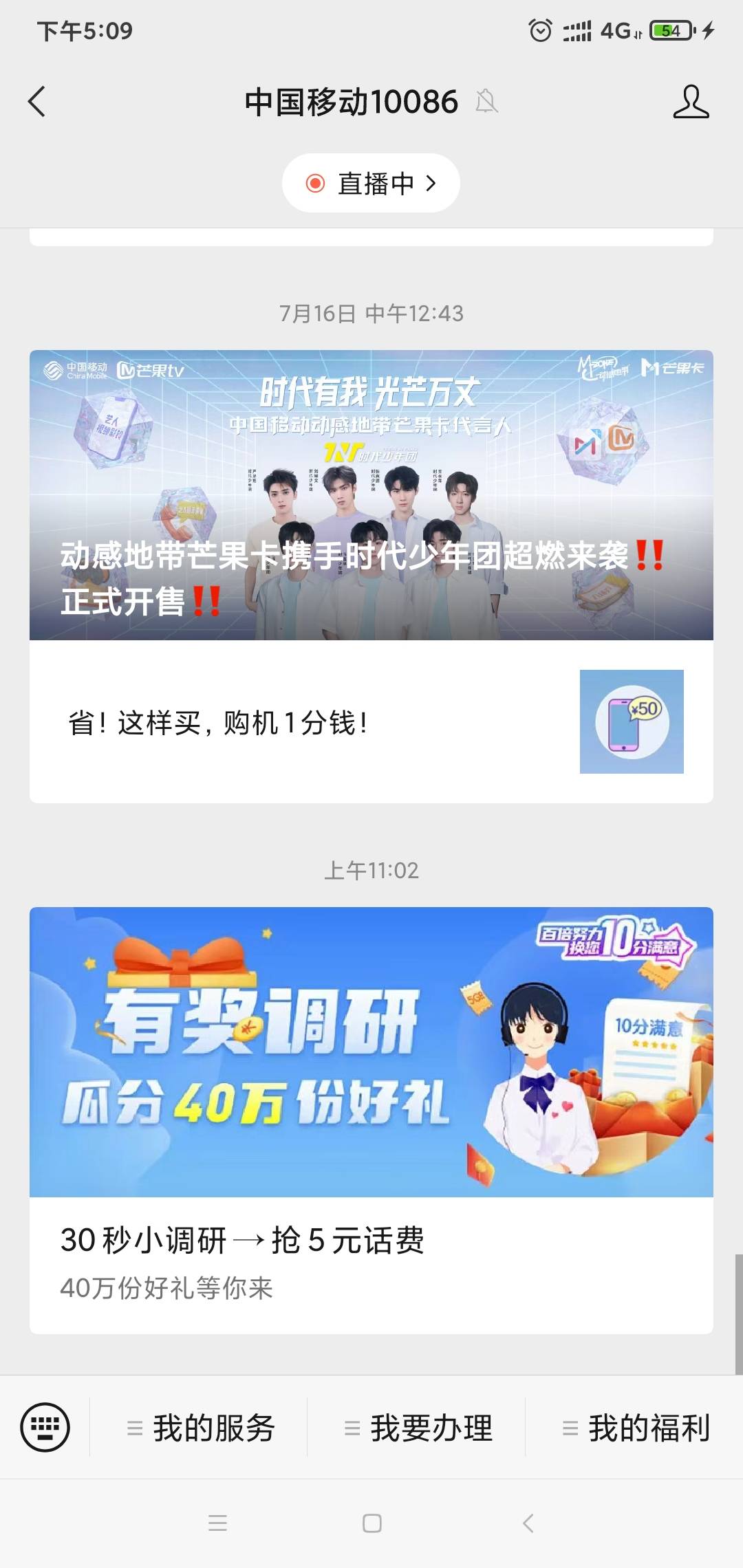 中国移动10086公众号 评价5话费和流量随机。我中了5g流量,自测