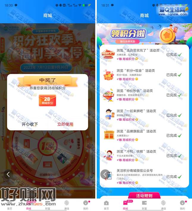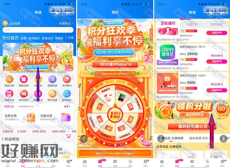 和包APP-底部【商城】-顶部横幅【积分狂欢季 福利享不停】-1积分抽奖-再下拉至【领积分啦】做任务领积分