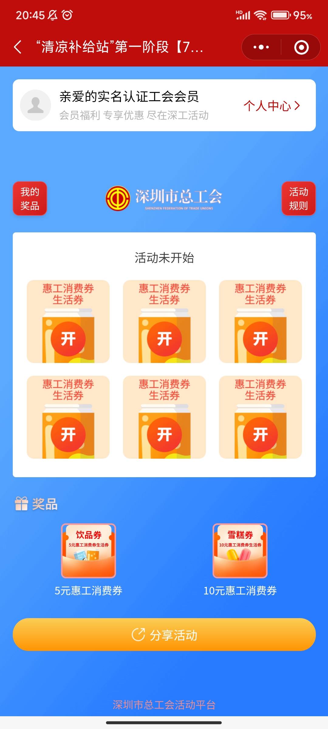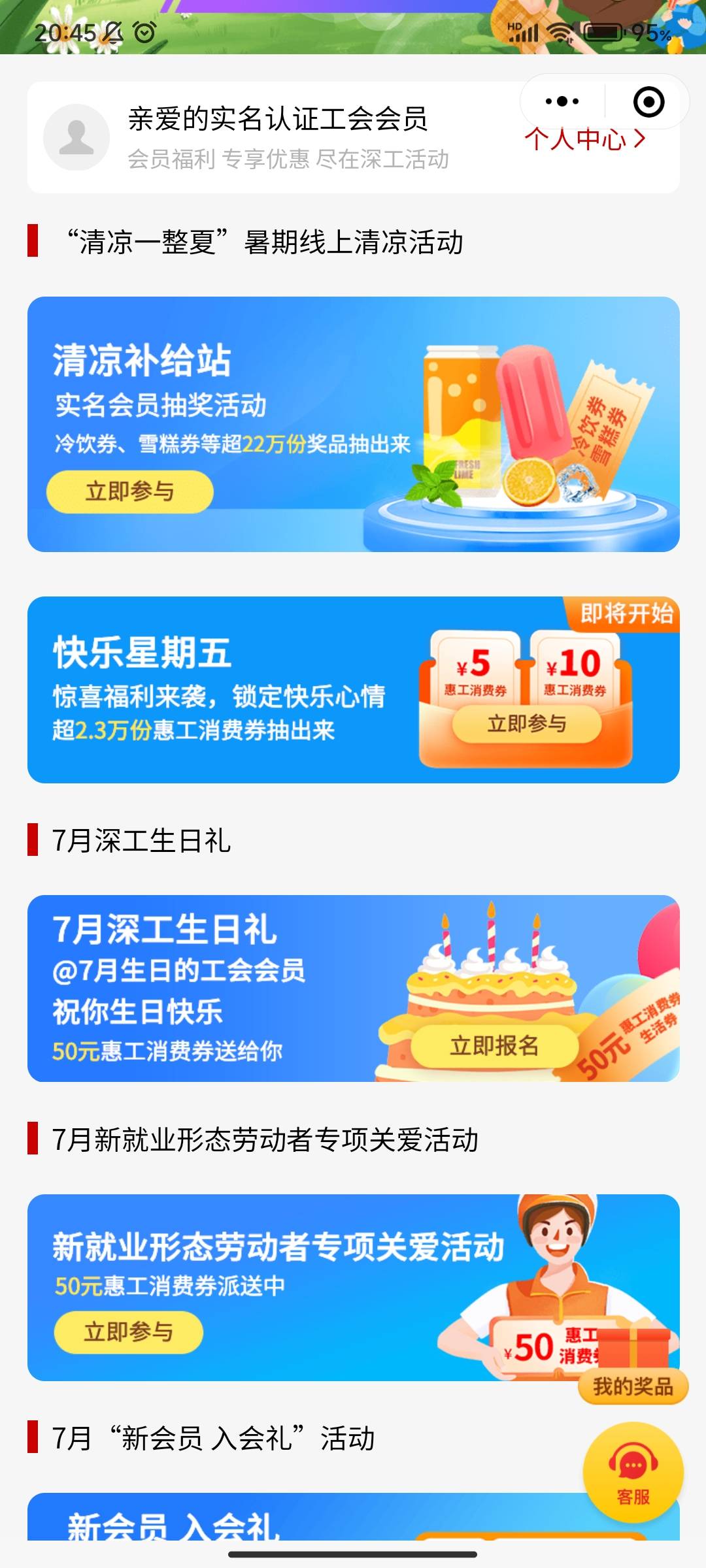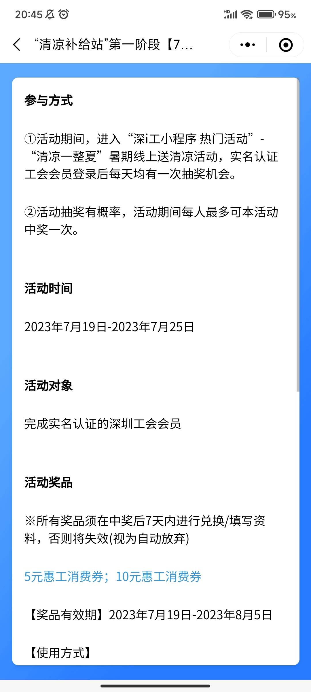预告:明天,深工会活动。。。 路径: “深i工小程序 热门活动”-“清凉一整夏”暑期线上送清凉活动,实名认证工会会员登录后每天均有一次抽奖机会。 ②活动抽奖有概率,活动期间每人最多可本活动中奖一次。 活动时间 2023年7月19日-2023年7月25日 活动对象 完成实名认证的深圳工会会员