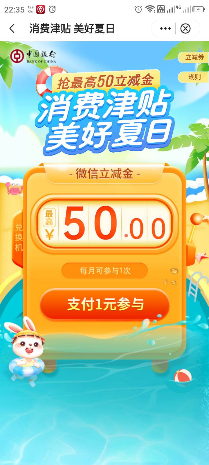中行最高50立减金 :app,城市服务,会自动弹出一个50立减金活动,支付1元随机,我个人抽到3.98立减金,看运气,看不上的勿喷哈