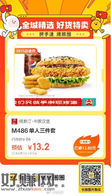 塔斯汀中国汉堡|M486 单人三件套,13.2