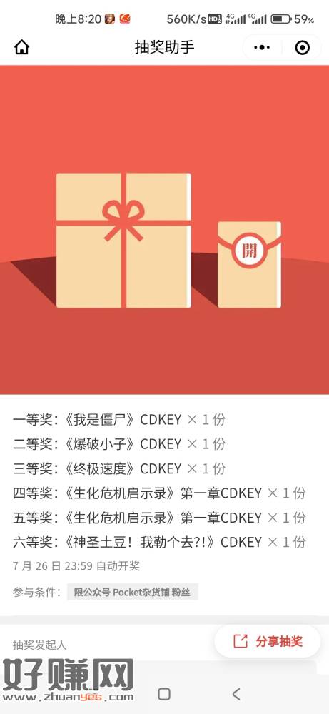 关注【Pocket杂货铺】回复“抽奖” 参与抽奖 奖品: 游戏兑换码【可以卖】 开奖时间:7月26日