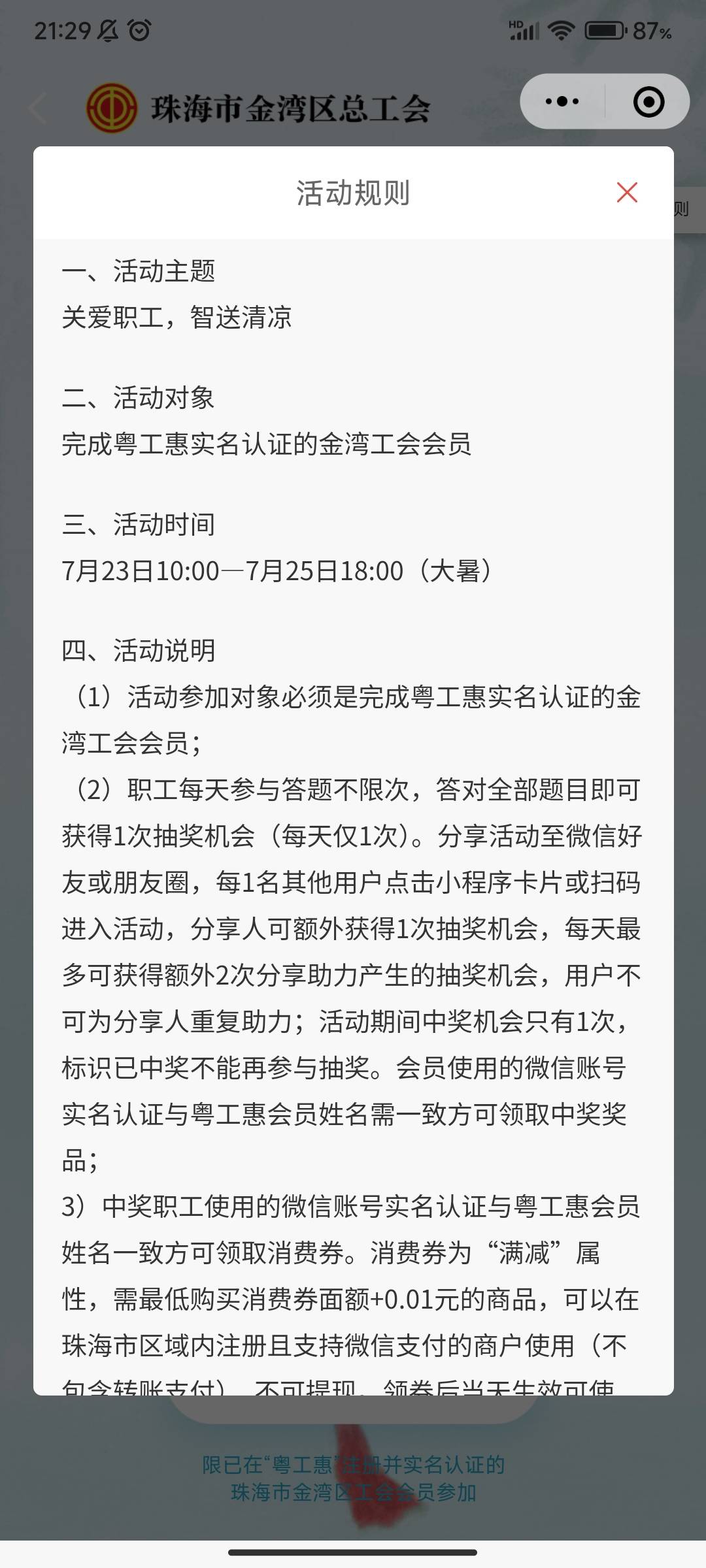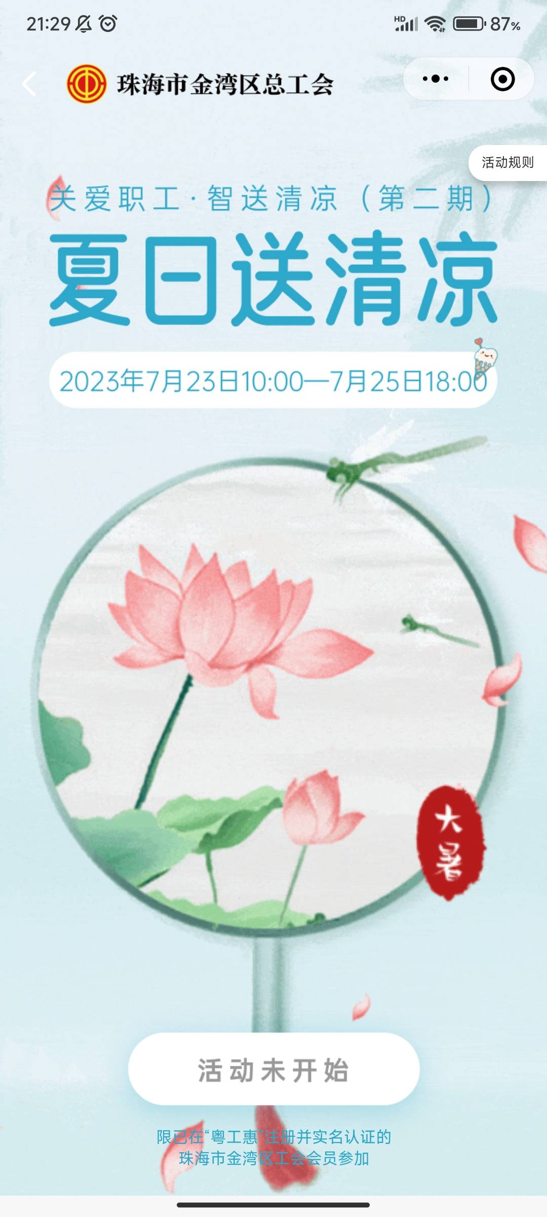 超级预告:7月23号10点,金湾区送清凉活动。。。提前预告,因为时间尚早,还可以加入新业态!!! 今天21号,也就是现在加入新业态,还有机会申请通过!!!22号审核,23号就可以答题抽奖!!!图片这个新业态可以去试试!!! 活动内容是这么说的: 7月23日(大暑)至7月25日, 开展“关爱职工,智送清凉”第二期活动! 进入活动页面参与答题 有机会抽中10元、30元、 50元、100元“清凉消费券”! 数量有限,领完即止