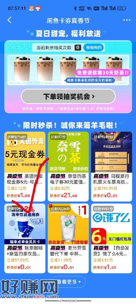 咸鱼,我的,请你喝奶茶,有1.88买美团外卖5元现金券