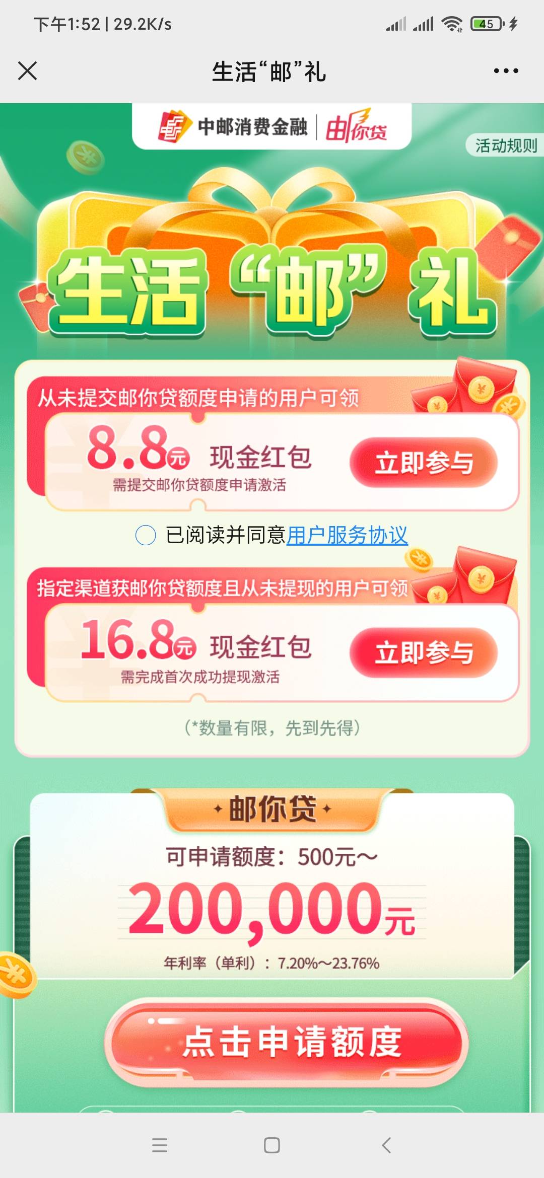 邮生活gzh-平台首页-邮你贷-先领8.8,再申请一下,激活8.8,提现,